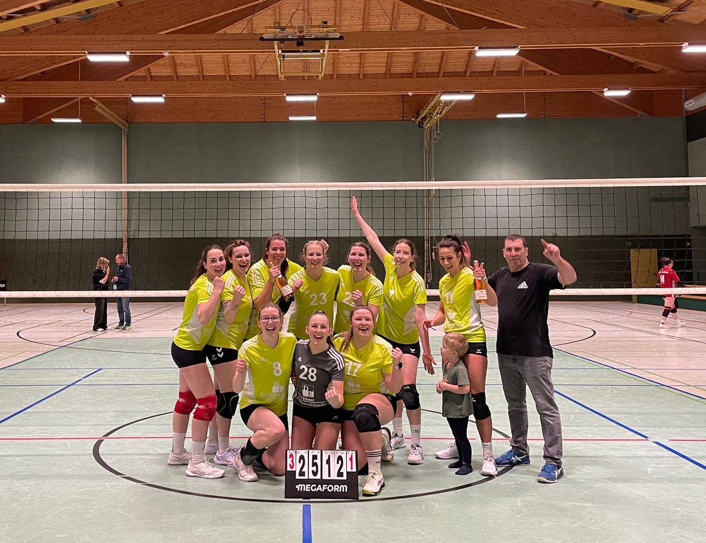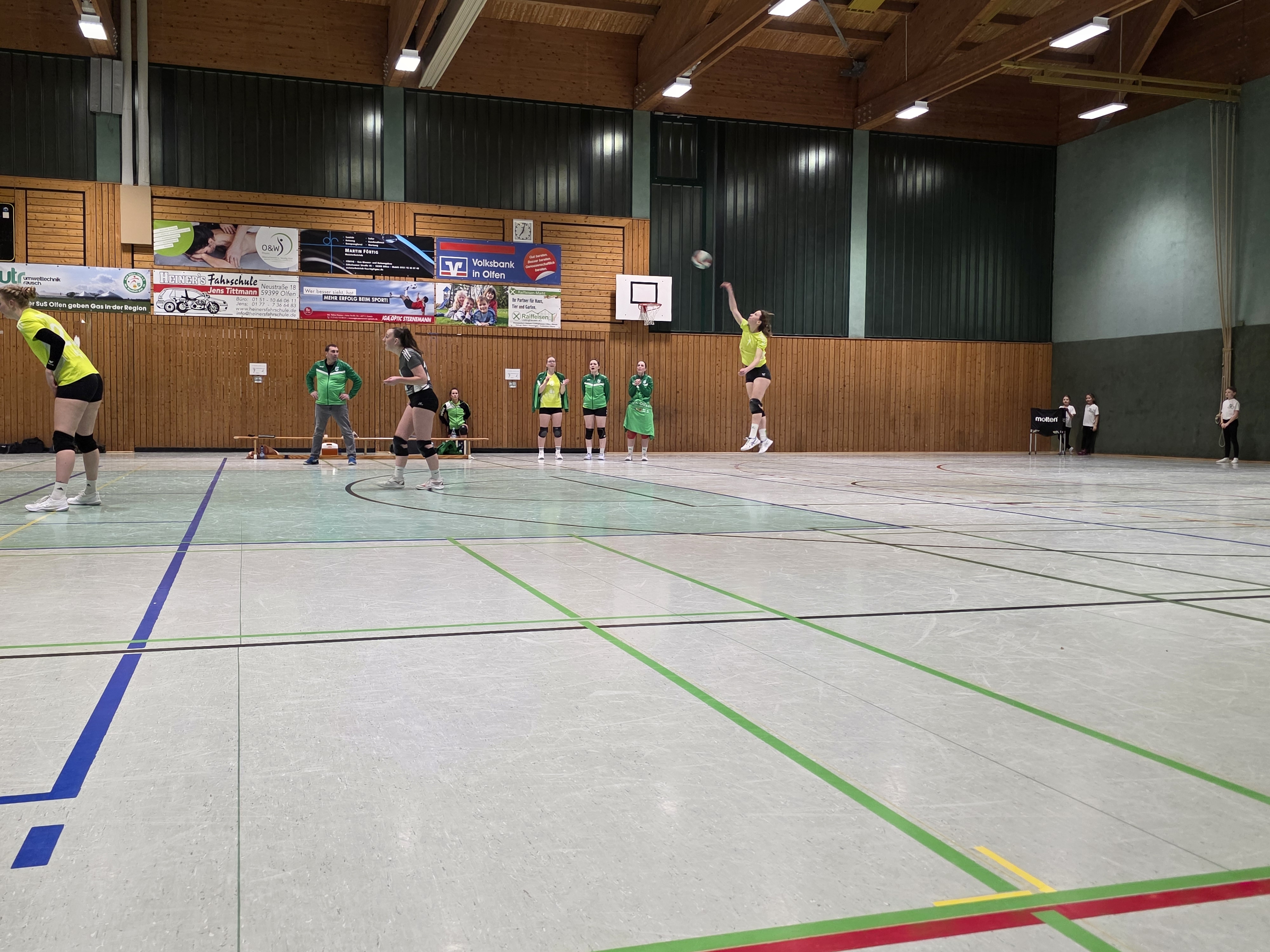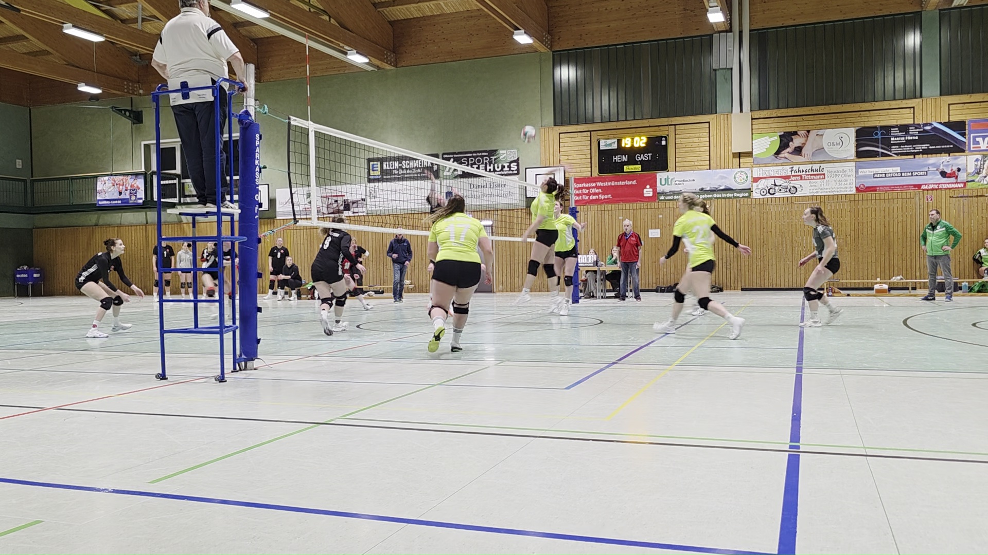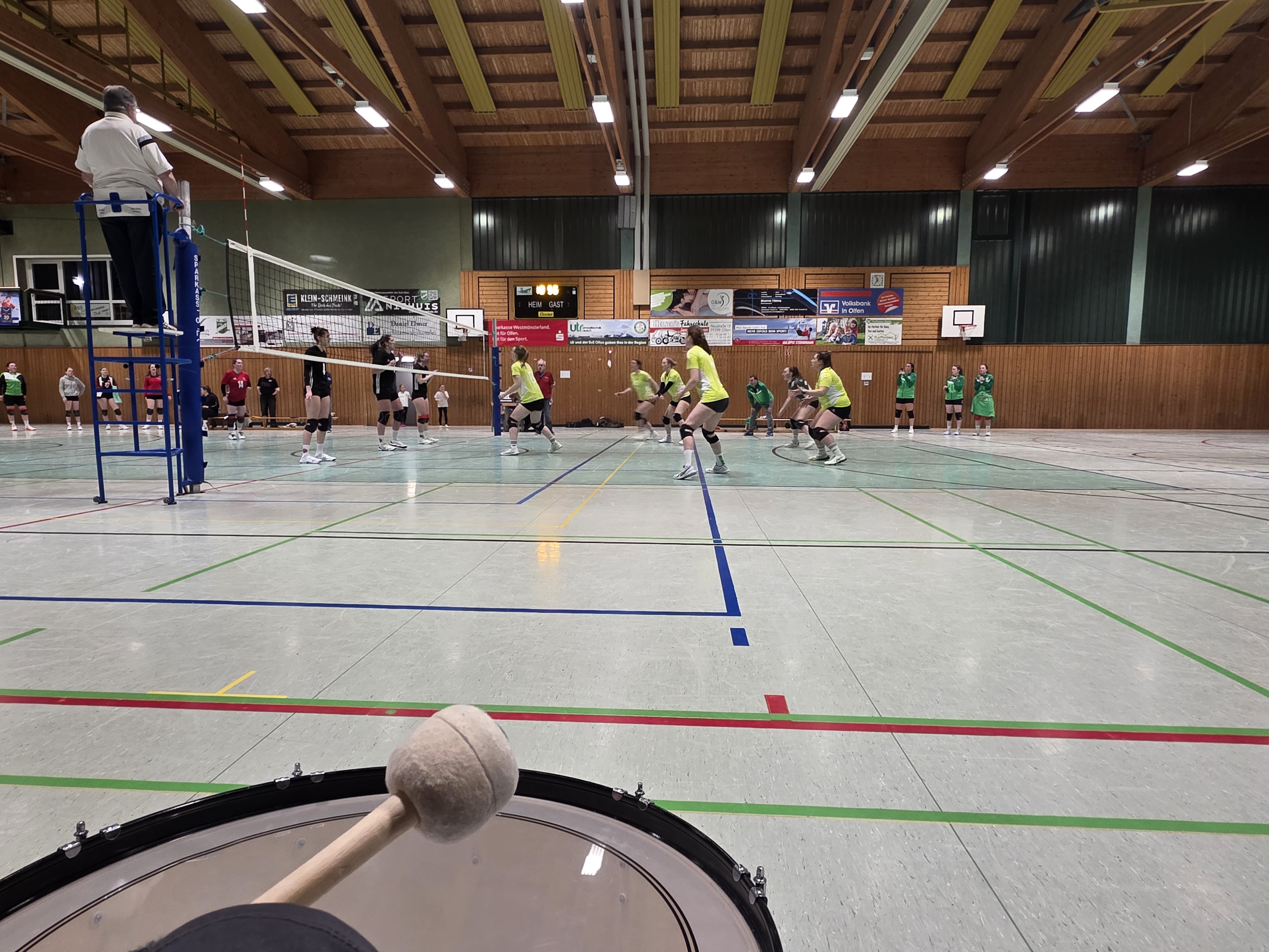 Die Damen 1 beendeten das Volleyballevent um 18:00 Uhr gegen den Tabellendritten ATV Haltern. Zwar zu ungewohnter Zeit, trotzdem volle Hütte und mit einer bestens aufgelegten Fankurve. Das musste ja beflügeln und Olfen begann stark. Gleich zu Beginn eine deutliche Führung, über 8:3 und 18:7 wurde es ein klares 25:13 im Ersten. Schreck zu Spielbeginn, als Jana Köhler und Antonia Lütkenhaus mit den Köpfen zusammengerasselt sind. Zum Glück nichts Schlimmes passiert, Julia Lütkenhaus ersetzte Jana, für Antonia ging es erstmal weiter. Spannend dann der zweite Satz, bis ins Finale ausgeglichen machte Olfen zum Schluss die Bigpoints, 25:22, wichtig! Wie so oft im Volleyball die Krise im dritten Satz, zu viele Fehler und mit 25:17 stellte Haltern den Anschluss her. Jetzt galt es den Tiebreak zu vermeiden und Olfen war plötzlich wieder da. Mit druckvollen Aufgaben und Angriffen ein deutliches 25:12 und großer Jubel zum 3:1. Bestnoten verdiente sich Libera Heidi Price, die ein ums andere Mal die Angriffe des ATV Haltern entschärfte. Damit hat man bei einem Spiel weniger als Haltern, die Chance auf den dritten Platz zu klettern. Super Mädels.