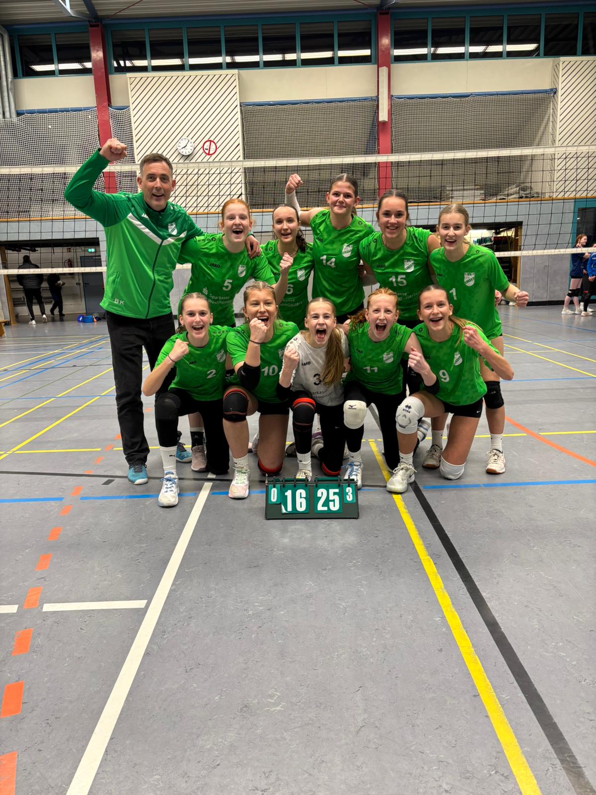 Die erste Mannschaft trat am vergangenen Wochenende auswärts beim Abstiegskandidaten der SG Recklinghausen an. Der Einsatz von Zuspielerin Antonia und Diagonal Jana war lange fraglich, hatten beide doch mit einer leichten Gehirnerschütterung nach ihrem Zusammenprall in der Vorwoche zu tun. Glücklicherweise wurden beide rechtzeitig fit. Das Spiel gegen die SG Recklinghausen lässt sich mit dem Stichwort „Arbeitssieg“ am besten beschreiben. 25:19, 25:18 und 25:11 und somit 3:0 sind deutliche Satzgewinne, die Punkte wurden jedoch unspektakulär und mit viel Kampf eingefahren, weil Recklinghausen nie aufsteckte. Toll, dass Pauline aus der Zweiten zu ihrem ersten Einsatz kam und sofort mit einem Killblock den Weg zum Matchball bereitete. Jetzt geht es in den Endspurt der Saison und vielleicht kann man ja Lüdinghausen auf Platz 2 noch ein bisschen ärgern.