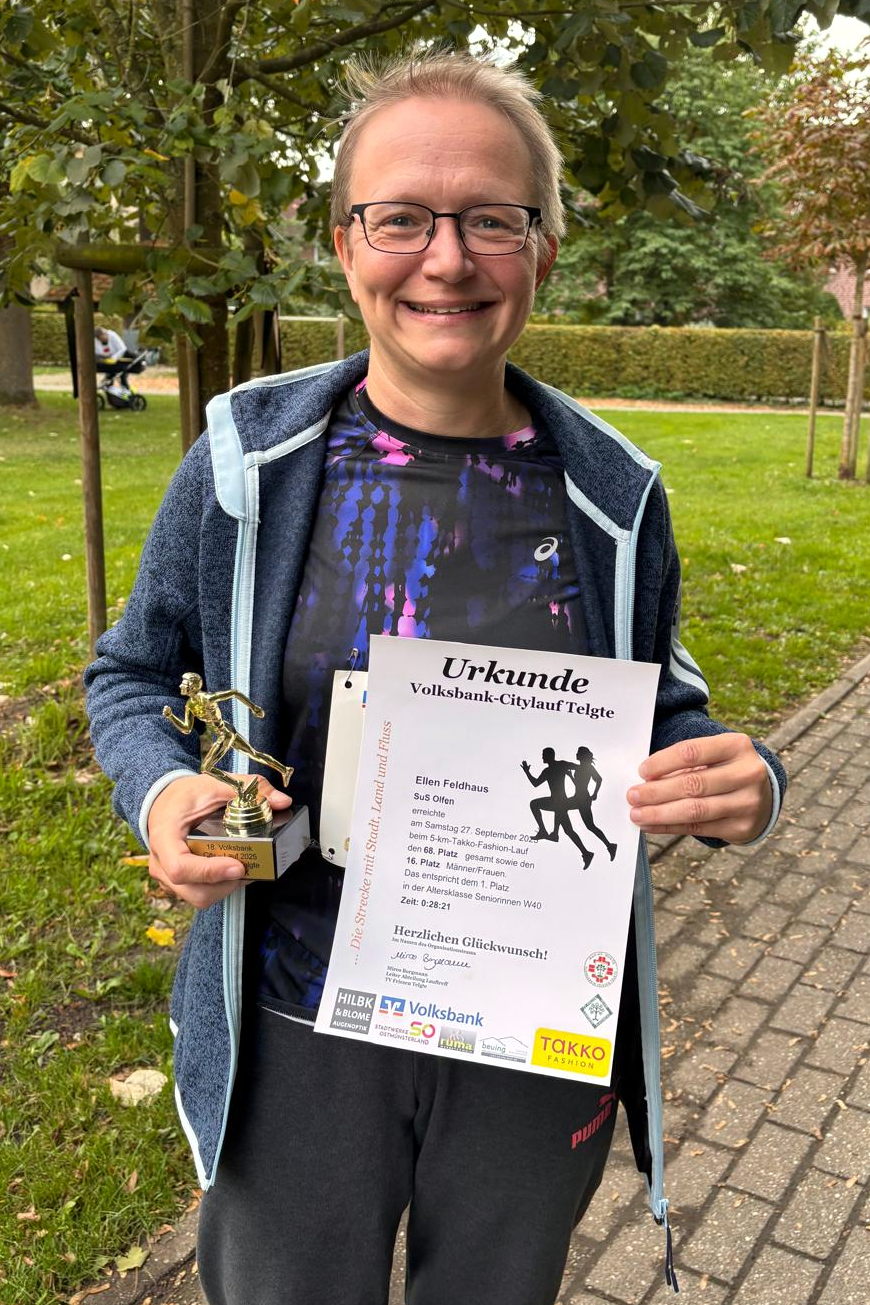 Sieben Jahre Wettkampfpause sind beendet: Ellen Feldhaus trat erstmals wieder an die Startlinie und konnte gleich den Sieg in ihrer Altersklasse im 5-Kilometer-Straßenlauf in Telgte davontragen .