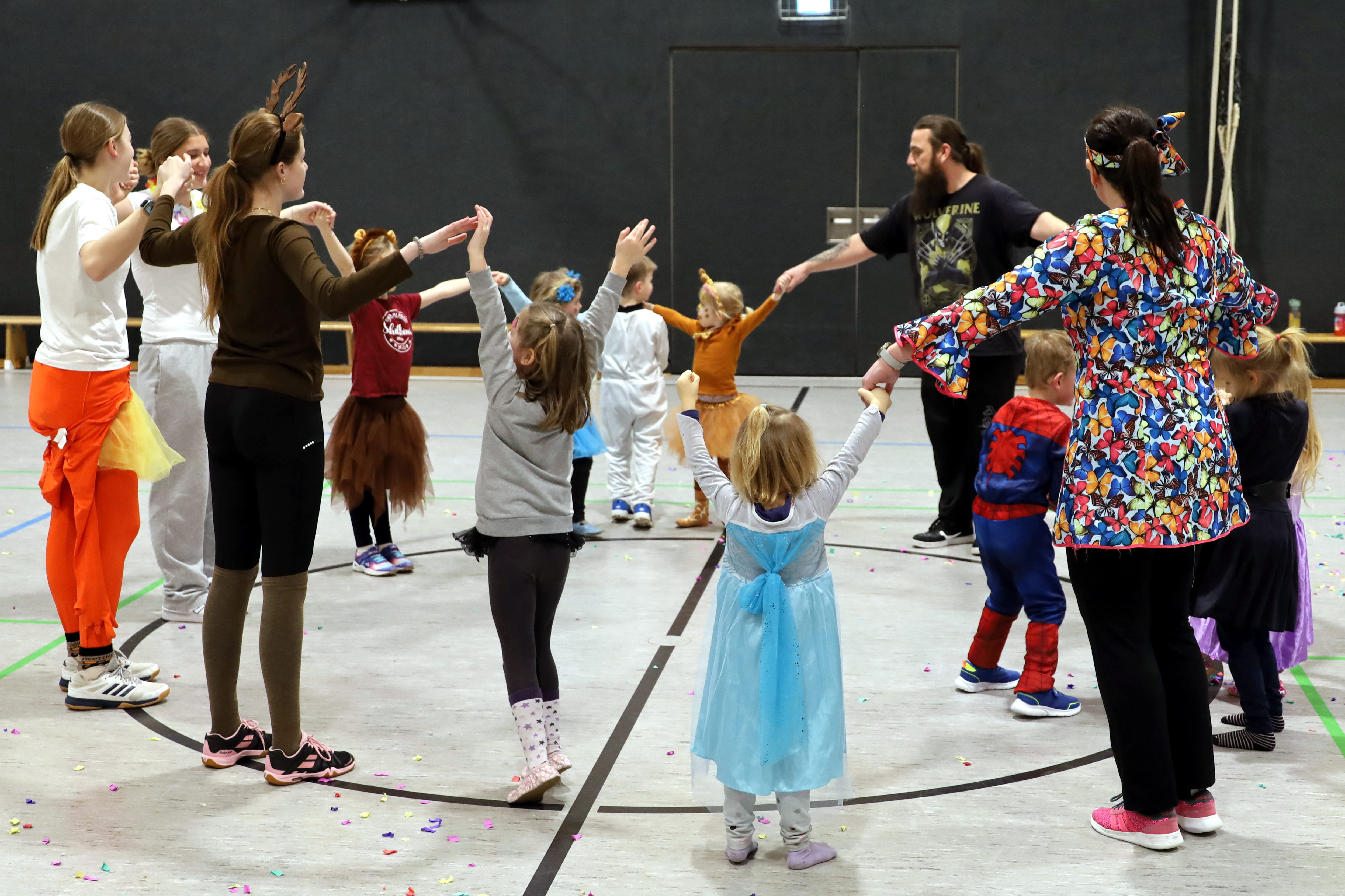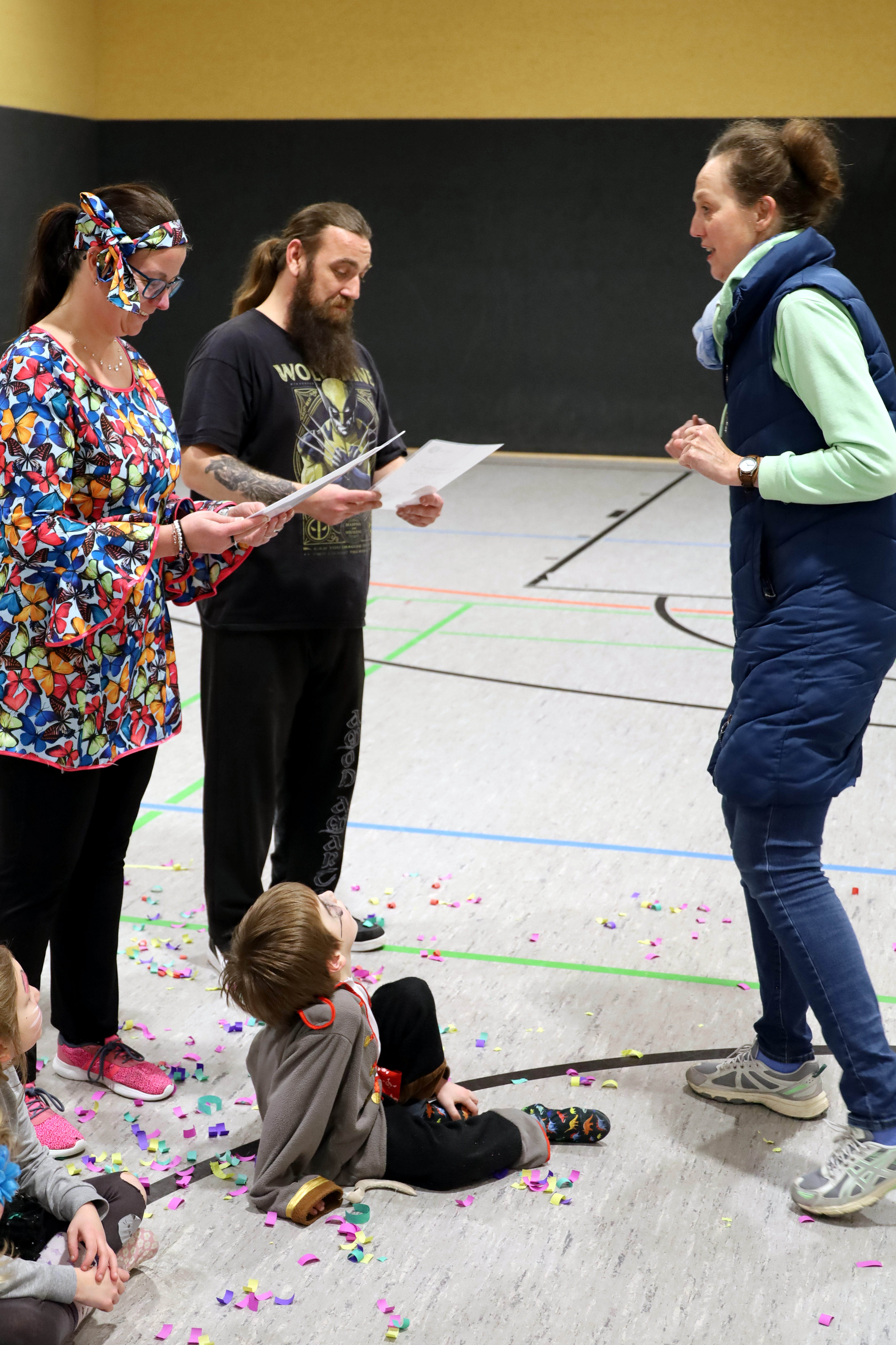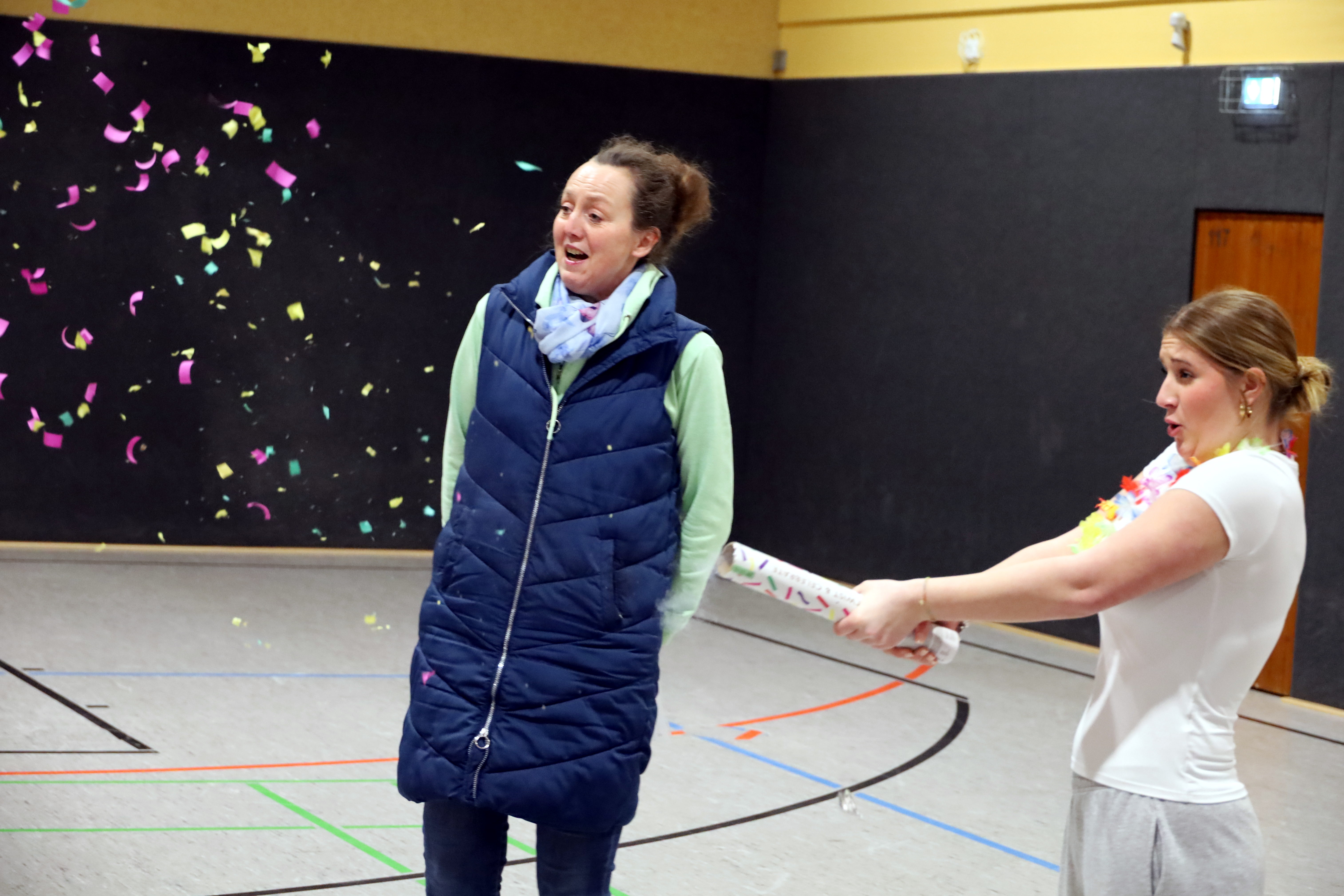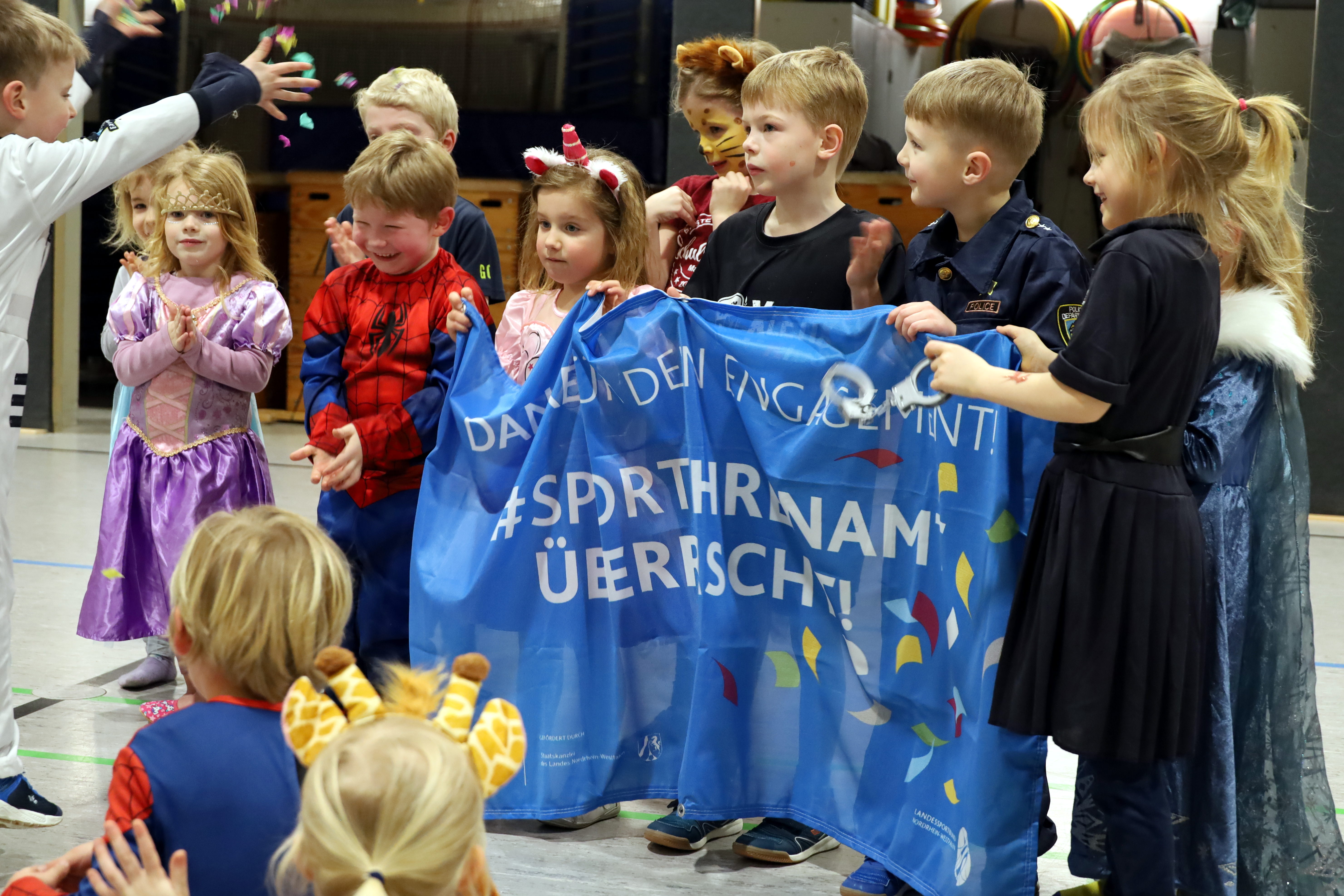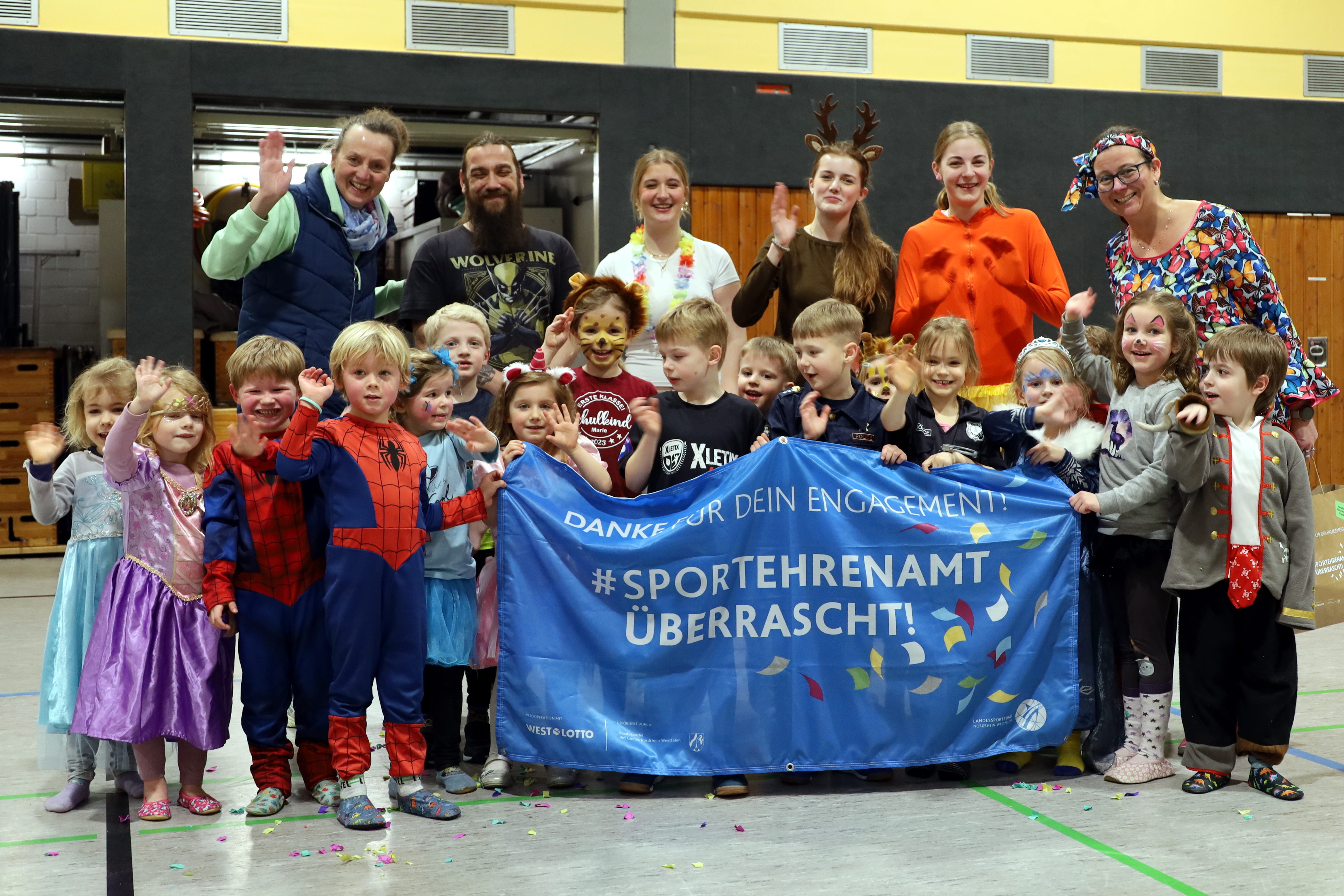Und so war die Überraschung bei Frauke und Kai groß. Die etwa 20 Kinder, die durch die Halle tobten, stimmten sofort ein und freuten sich nicht nur über Konfetti, sondern auch darüber, dass es "ihre" Übungsleiter waren, die das Überraschungspaket des Landessportbundes überreicht bekamen.